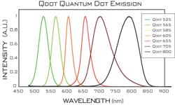 QD's produce a bright and non-photobleaching emission with narrow symmetrical emission spectra. They also allow multiple colours to be excited simultaneously using a single excitation wavelength. As explained above, the colour of QD's, both in absorption and emission, can be 'tuned' to any chosen wavelength by simply changing their size. Therefore by using only a small number of semiconductor materials and an array of different sizes, researchers have access to QD's with colours that span from ultraviolet to infrared. While choice of material dictates the region of the spectrum available for emission from these particles, it is the size of the particles that tunes the emission wavelength (Figure 2).