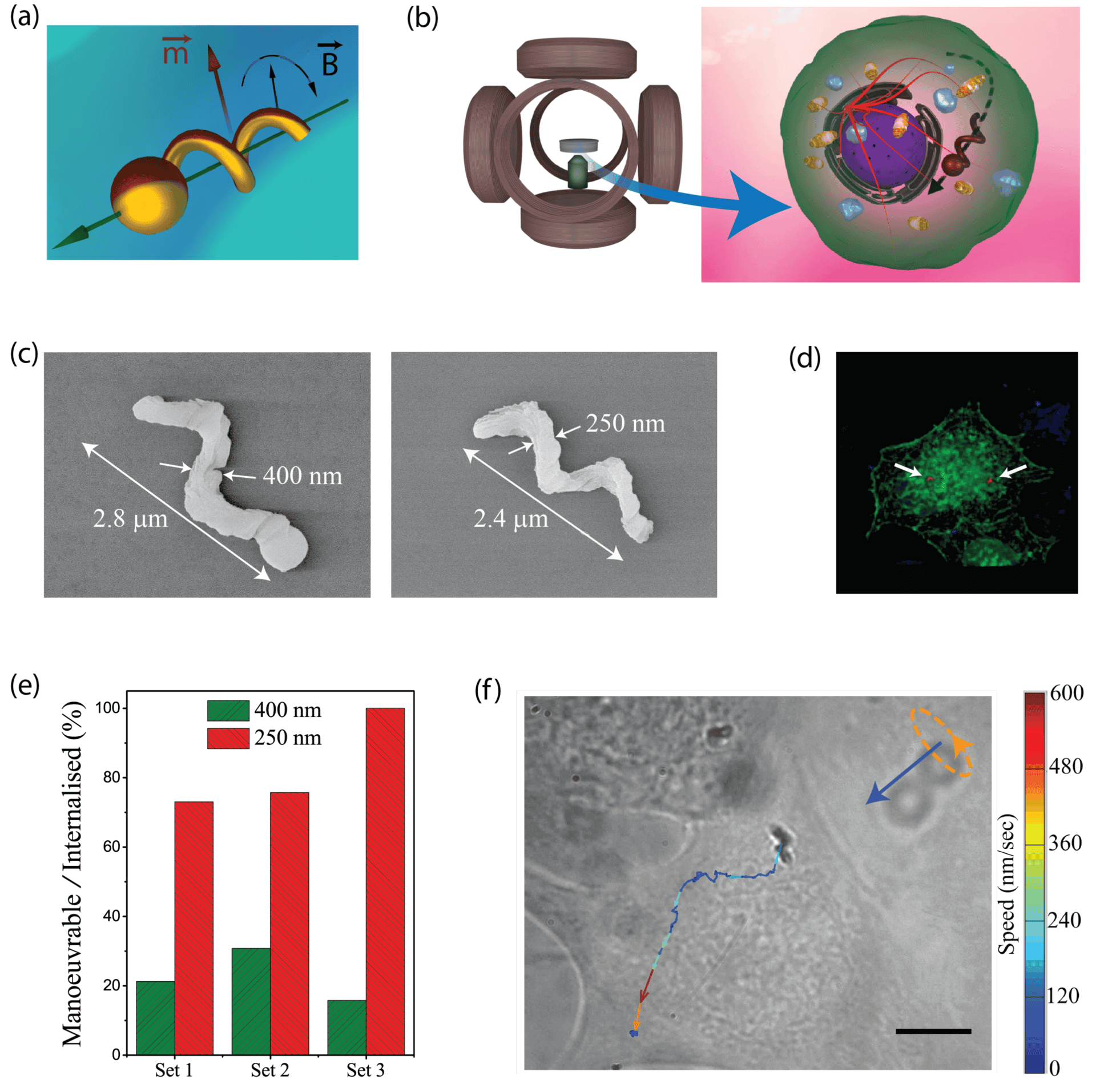 Design and manipulation of helical nanomotors inside cells. (a) Schematic of the actuation scheme, where the helix rotates in sync with the magnetic field. The rotation results in translation of the helical nanomotor. The helical shape is predominantly made of SiO2 (yellow), with a thin film of magnetic material (here iron, brown) deposited on the SiO2. (b) Schematic of the experiment: Petri dish containing the cells and the helical nanomotors are placed in a triaxial Helmholtz coil built around an optical microscope. The motion of the motors travelling through the intracellular space is recorded and analysed. (c) SEM image of nanomotors. Left panel: larger: 400 nm _ 2.8 _m, right panel: smaller: 250 nm _ 2.4 _m. (d) Single HeLa cell containing two nanomotors, a snapshot of a 3D rendered video (movie M1) made from a stack of confocal images. Blue, nucleus; green, actin filaments and red, nanomotors (pseudo coloured). The scan region dimensions were 64 ยตm x 51 ยตm x 7 ยตm. (e) Ratio of manoeuvrable to total number of nanomotors that were internalized by the HeLa cells, for the two designs. Results from multiple experiments show higher manoeuvrability with the thinner motors. (f) Vector plot of speed of a nanomotor moving inside a cell (BAEC), scale bar 5 ยตm. Also shown is the intended direction of the motor as defined by the rotating magnetic field (top right corner). (Source: M. Pal, N. Somalwar, A. Singh, R. Bhat, S. M. Eswarappa, D. K. Saini, A. Ghosh, Adv. Mater. 2018, 1800429. Copyright Wiley-VCH Verlag GmbH & Co. KGaA. Reproduced with permission.)