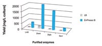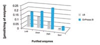 Figure 3 >30-fold increase in active enzymes, haloalkane dehalogenases(Fig.3a) and >3.3-fold increase in specific activity (Fig.3b). Specific activity determined with 1,2-dibromoethane (LinB, DhaA and DbjA) and 1-bromobutane (Spur). Comparison of an EnPresso B growth system with a commercially-available LB growth media. Results courtesy of Luká_ Chrást, Masaryk University, Czech Republic