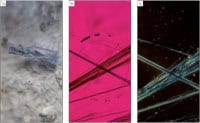 Chrysotile has a distinctive dispersion staining, with fibres parallel to the tint plate appearing purple, and perpendicular fibres appearing blue (image 1c). This type of asbestos is usually found in reinforced composite materials like vinyl floor tiles and window sills; corrugated cement roof sheets; asbestos textiles and insulation boards; and textured coatings like artex ceilings. The sample was then re-bagged and the viewing dish and tools thoroughly cleaned to avoid cross contamination of samples.