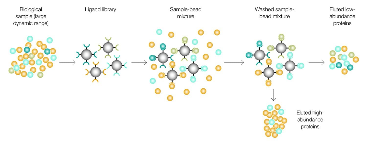 Each bead features a different hexapeptide ligand with affinity for specific proteins in a sample. Samples are applied to the beads, allowing proteins to bind their specific ligands. Proteins in excess are washed away, and those proteins bound to the beads are eventually eluted, allowing further downstream analysis