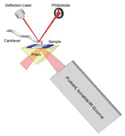 AFM has been enormously successful in addressing problems in basic nanoscale research as well as applied problems in both the materials and life sciences. However, a gap in the AFM's capabilities has been the ability to chemically characterise regions of the sample. This is especially important in the study of heterogeneous materials like polymer blends, multilayer films and nanocomposites. Several AFM probe-based techniques have been used to beat the diffraction limit of conventional IR measurements. Traditional IR microscopy has a resolution limit roughly three times its wavelength, on the scale of many to tens of microns. Various optical scattering methods attempt to relate spectral optical properties of materials to their chemical composition. In general, near field approaches are single or narrow band and do not produce rich spectra that can be used to characterise a broad range of vibrational resonances associated with different chemical species. Other IR techniques are based on measuring the local temperature rise from spectral absorption through the use of AFM cantilevers integrated with conventional Fourier Transform IR (FTIR) spectrometers. These approaches allow broader spectrum measurement than near-field approaches, but the spatial resolution is typically limited due to thermal diffusion to the scale of many microns.