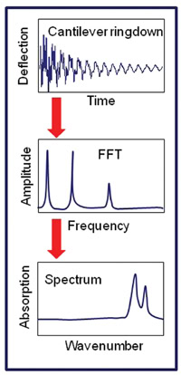 The co-averaged ring-down events are analysed to extract both IR absorption and mechanical properties. The ring-down events typically include one or more "contact resonances" meaning that the modes of oscillation that couple the cantilever's resonant properties with the mechanical stiffness and damping of the sample area in contact with the AFM tip. The peak amplitude of the ring-down and/or the amplitude of one or more contact resonance modes is extracted for each wavelength to construct an absorption spectrum. The contact resonant frequencies can be used to extract relative stiffness and sample viscosity, figure 1b.