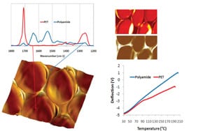 Infrared nanospectroscopy has also been used to make multifunctional measurements on composite materials. In this example, figure 3, polyethylene terephthalate fibres in a polyamide (nylon) matrix is imaged. The point spectra clearly identify the materials through the carbonyl and amide peaks.