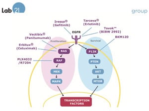 So, given the growing importance of biomarkers in personalised medicine, what can we expect to see change in the next 40 years?  Firstly, to return to the cancer situation, the identification of individual biomarkers such as k-ras or EGFR has been a radical breakthrough in managing colorectal cancer and NSCLC. Unfortunately, further clinical analysis still shows that some patients do not respond to these drugs as expected, even though their tumour profiles are suitable. In these patients, further investigation has now shown that other components of the target biochemical pathway (see Figure 5) may also be mutated, and if that is the case, then the patient may still not respond. What this indicates is that, for an individual tumour, future drug prescription to identify efficacy may require analysis of multiple factors simultaneously. For example, a drug targeting the EGFR pathway might require analysis of k- ras, b-raf, MEK and MAPK to ensure that all components of the target pathway are suitable for that drug. Therefore we are likely to see new diagnostic platforms emerge that are capable of determining multiple biomarkers at the same time, in contrast to the current situation where molecular analysis of multiple mutations, e.g. k-ras or EGFR, are usually monitored separately for each individual gene rather in combinations. Already new platform technologies are being developed to enable this multiplex analysis, and these platforms are being increasingly used in centralised reference laboratories to deliver this information.