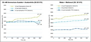 In addition to offering the lowest back pressure increase, hydrophilic PTFE filters also show the best chemical compatibility for various solvents and mobile phase modifiers commonly used in UHPLC (Table 2).