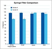 When using sample filtration techniques, it is important to understand that the retention characteristics of syringe filters can vary, and this variance can impact the quality of sample preparation. Figure 1 compares the retention characteristics of syringe filters from two different suppliers. The data show that when comparing nylon and PES membranes, both products show similar particle retention (> 95%). In the case of PTFE and PVDF, membrane filters from Supplier A retain greater than 95% particles, but the membrane filters from Supplier B only retain about 80% of particles. The filters from Supplier B, which allow 20% of the particles to pass through, may cause a column to clog.