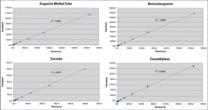 Assay linearity ranged from 15 ng/mL to 12,500 ng/mL for benzoylecgonine, ecgonine methyl ester and cocaethylene, and from 15 ng/mL to 5000 ng/mL for cocaine (Figure 3). The limits of detection (LOD) and quantitation were found to be 15 ng/mL using a 2 mL sample size, and the intra- and inter-day precision of < 10% CV were calculated at the quality control levels of 60 ng/mL and 187.5 ng/mL. Correlation coefficients (R2) were better than 0.9990 for cocaine, benzoylecgonine, ecgonine methyl ester and cocaethylene based on a one point calibration. Pseudoephedrine at a concentration of 20,000 ng/mL showed interference with ecgonine methyl ester at the 40% and 125% quality control levels. Norcocaine at a 10,000 ng/mL concentration demonstrated no interference with any analyte tested, but limited coelution was observed with cocaethylene. Relative retention time to cocaethylene was 1.005.