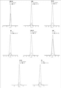 Batches were reviewed for conformance to quality control criteria regarding both quantitative and qualitative performance, based on EWDTS guidelines. All quality controls within a batch demonstrated quantitative results within ± 20% of their expected (theoretical) concentration. Additionally, ion ratio ranges for qualifier ions for target compounds were established using ± 20% of the ratios calculated for the 150ng/mL calibration standard. These ranges were used to assess ion ratio performance. The software performed ion ratio confirmations, retention time checking and quality control conformance automatically as a part of batch acquisition and processing. For precision analyses, a coefficient of variation (CV) of < 10% of the average calculated quality control amounts was required for each analyte and inter-day percent differences of calculated amounts also had to be less than 10%.