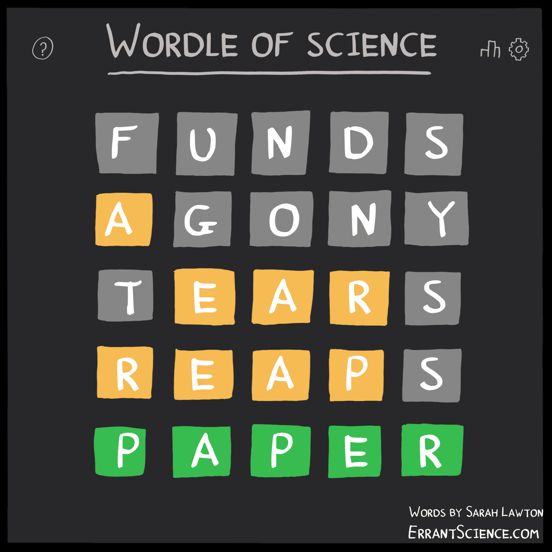 You get your results back from your experimental first run. All black except a few points in one corner which are yellow. You repeat your experiment, this time the points in the corner have moved along and are now green with some more yellows either side. You repeat the experiment a third time and now everything is black again because you actually used the wrong concentration, but you get the idea. I mean to some extent this does already happen. I've worked for supervisors before that would happily return my results in colour coded format, with the bits they think are wrong and with a note to come back when I get them all right. But unlike Wordle, that colour coding was only red and more based on wishful thinking than accuracy.