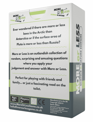 As with many quick play games, this is a fun โpick up and playโ to test your knowledge or deduction โ for example is the top speed of a domestic cat more or less than an elephant? And was the term Biology first used more or less than 500 years ago? Some lighthearted competition is inevitable and you will gain knowledge you didnโt even know you needed to know (an elephantโs skin can be as thick as five smartphones/only 7% of people are left handed).