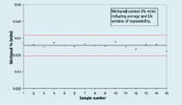In this particular series of analyses the average concentration over 15 FAME samples from the universal sample was 0.038% methanol (standard deviation 0.0007 and relative standard deviation RSD (%) 1.96)8. Furthermore the repeatability figures indicate that the system was optimised for analysis as set out in EN-14110 as seen in Figure 3, where the analyses trend line is within the repeatability window and the addition of the average line.