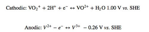 Most batteries rely on two chemicals that change valence state (or charge or redox state) in response to electron flow which converts chemical energy to electrical energy and vice versa. In the Vanadium flow batteries, one electrolyte is used but in varying oxidation states in the form of salt solutions. A crucial component is the membrane which separates them. The solar panels or wind turbine usually provides electrons and pumps push spent electrolyte back through the electrodes, where the electrolyte is recharged and returned to the holding tank. Membrane research associated with Vanadium batteries has opened a whole new programme of study among electrochemists and engineers.