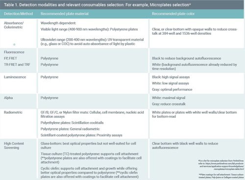 Choice of assay compatible consumables such as microplates, as well as liquid handling accessories, contribute to the performance, accuracy, and reproducibility of a screening assay. Microplates that minimise crosstalk and background signal as well as offer miniaturisation, ease of use with automation, and conserve reagents must be evaluated. See Table-1.