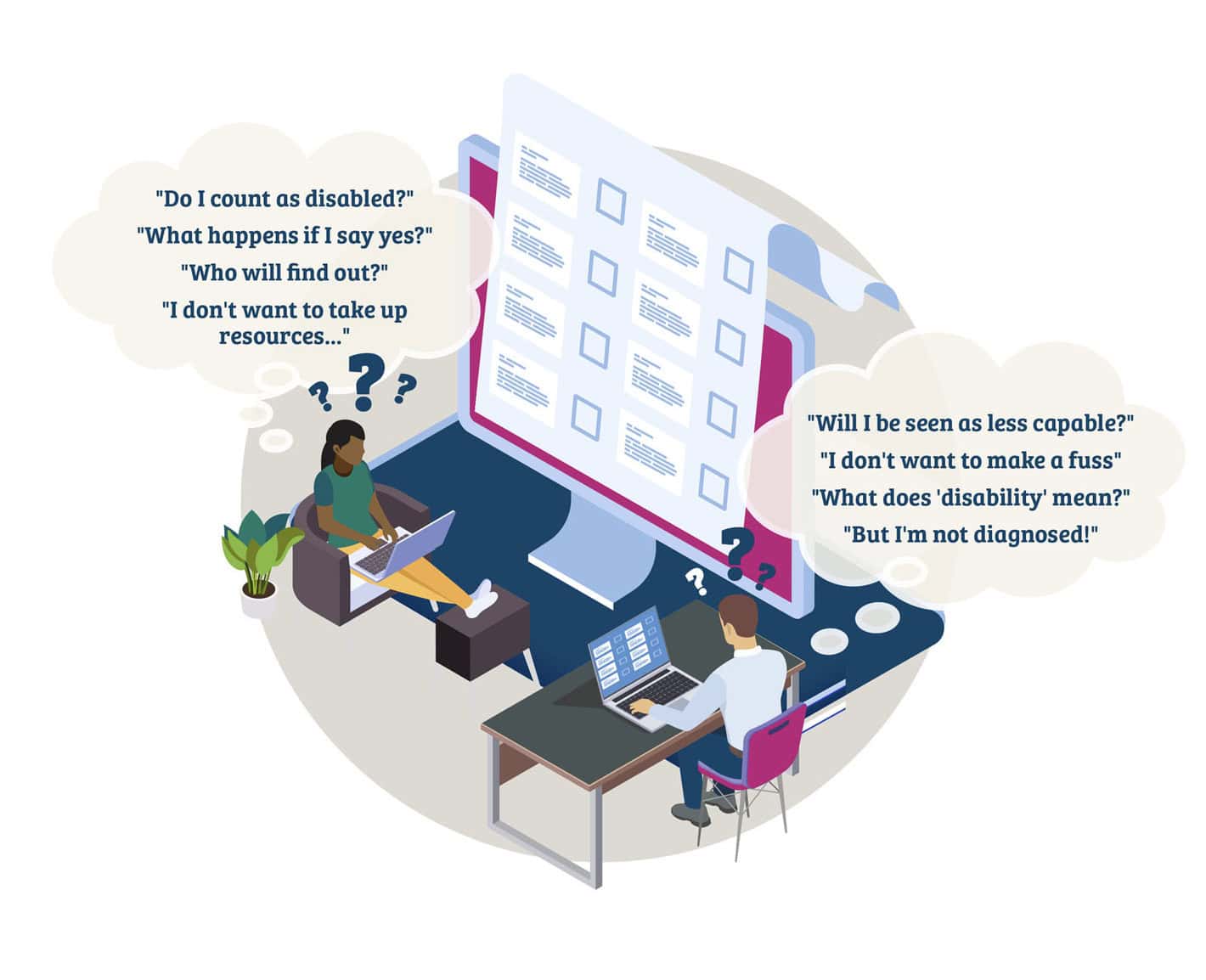 These encompassed societal stigma, the impact of imposter syndrome, concerns related to privacy or data usage, and a pervasive lack of awareness regarding what can โ€˜countโ€™ as a disability.