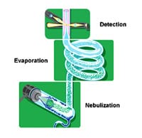 Figure 1: The three main steps used within ELSD technology: (1). Detection ~ the solvent and sample coming from the LC system are aerosolised with pressurised nitrogen in a nebulisation chamber. Large droplets impact the detector walls and leave the detector through a drain. (2). Evaporation ~ small droplets, swept along by the nitrogen gas, enter a heating tube where they are evaporated at a controlled temperature of ambient +5°C up to 100°C. (3). Nebulisation ~ non-volatile materials, including non-volatile mobile phase residue and solutes, enter the detection chamber and scatter the light of a highly efficient LED. A photomultiplier measures the intensity of the scattered light, which corresponds to the concentration of non- and semi-volatile compounds coming from the LC system. It is impractical to include non-volatile components in the HPLC mobile phase or to use solvents having relatively high non-volatile residue (>1ppm).