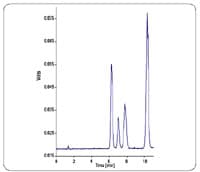 The gradient elution was found to perform the analysis in the shortest duration. To protect the carbohydrate separation column and to avoid any contamination, a short C8 pre-column was used. A water/acetonitrile gradient was used to separate the carbohydrates. The four selected components (fructose, sorbitol, glucose, sucrose) were separated in less than 12 minutes with complete resolution using a linear gradient pattern (Figure 3). For such an analysis, sensitivity is not an issue because the carbohydrates were present at high levels in juices. The injected masses on column were in the μg range.