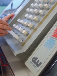 The RABIT is used to measure changes in the culture medium's electrical conductance that occur when charged metabolites are produced by the bacteria of interest. Dr Forsythe's group is using six separate modules at different temperatures to measure samples at set time intervals over a range of dilutions. A calibration curve is produced for each organism, where the time to detection is directly proportional to the growth rate and indicative of real-time microbial activity.