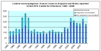 For most people, Listeria infection results at most in a mild and relatively harmless flu-like illness or gastroenteritis, and it exists in a harmless carrier state in a small proportion of the population. However, in vulnerable groups it can have serious consequences. Pregnant women, older people and those with compromised immune systems are much more susceptible. In pregnancy it is especially dangerous because although the illness is unlikely to be harmful for the mother, it can cause miscarriage, premature delivery or severe illness in a newborn child. In non-pregnant adults it is an important cause of septicaemia and bacterial meningitis. Drawn from figures published by the HPA4, figure 1 indicates overall figures for human cases of Listeria monocytogenes in England and Wales.
