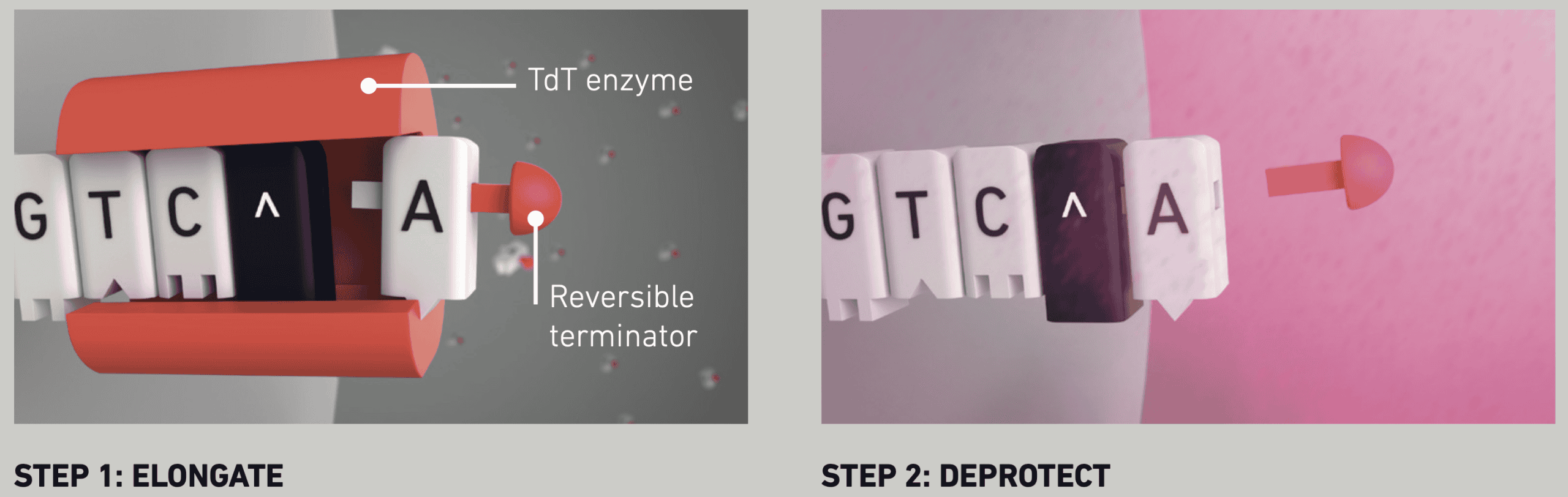 In DNA Script's process, oligos are enzymatically synthesised in a cyclic, two-step process. In the first step (elongation), the TdT enzyme adds a single nucleotide to a predefined initiator DNA (iDNA) affixed to a solid support. Each nucleotide has a reversible terminator to ensure only one nucleotide is added per cycle. In the second step (deprotection), a mild acid removes the reversible nucleotide terminator, preparing the strand for the next nucleotide. Steps one and two are repeated until the oligo is complete.