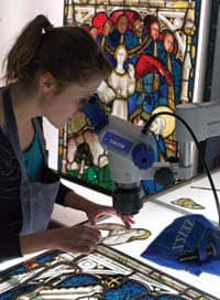 “Modern stained glass conservation is crucially dependent upon both highly skilled craftsmen and women and an intimate understanding of the chemistry of glass composition, materials science, environmental conditions and conservation ethics. When the fabric of any window is restored, our artists and glaziers are balancing the need to address the consequences of the deterioration and corrosion of the stained glass and the leading net with the absolute necessity to retain as much as possible of the original and unique glass. Therefore, every complete panel is examined and photographed in detail before any work commences – first with a Hasselblad medium format camera and then microscopically using a ZEISS Stemi DV4 SPOT zoom stereomicroscope equipped with a ZEISS AxioCam digital camera.