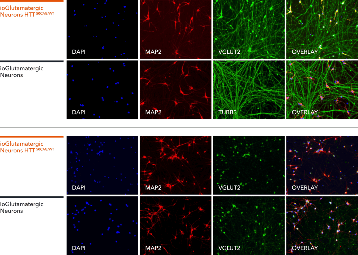 Immunocytochemistry/Immunofluorescence: Fig 2. Immunofluorescent staining of cells post-revival demonstrates similar homogenous expression of panneuronal proteins (MAP2 and TUBB3) and glutamatergic neuron-specific transporter (VGLUT2) in bit.bioโs ioGlutamatergic Neurons HTT50CAG/WT and in the isogenic control, by Day 11 (100X)