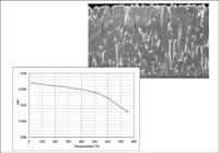 At Cranfield University, John Nicholls and co-workers have been using elevated temperature nanoindentation to investigate the mechanical properties of advanced TBCs for turbine engines. EB-deposited YSZ coatings are not at all "nano" in terms of their thickness, but are rather heterogeneous and columnar. Professor Nicholls realised that the individual erosive events occurring during use were on the scale of the individual columns and so it was necessary to probe their properties by small scale testing rather than bulk measurements. The variation in the TBC hardness/modulus ratio (a useful dimensionless index often important in tribological situations) with temperature is shown in Figure 1.