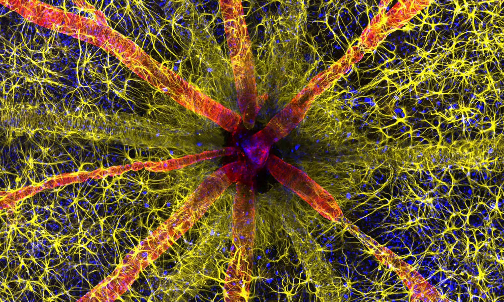 The picture by Qambari, who has been studying the condition since 2021, shows astrocytes (yellow), contractile proteins (red), and retinal vasculature (green).