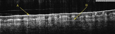 | Figure 1: OCT image of skin tissue of palm of the author. The horizontal bar is 1mm. Note the stratus corneum (A) and basal membrane (B) |