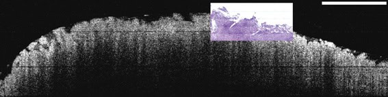 | Figure 2: OCT image of cancerous oesophagus tissue with superimposed histopathology image at the same scale, courtesy Dr. N.Stone, F. Bazant-Hegemark, Gloucestershire Hospitals NHS Foundation Trust |