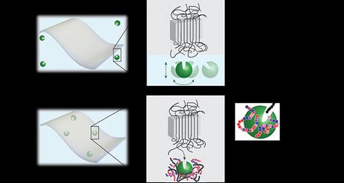 Xu suspects that higher temperatures make the enshrouded enzyme move around more, allowing it to more quickly find the end of a polymer chain and chew it up and then move on to the next chain. The RHP-wrapped enzymes also tend to bind near the ends of polymer chains, keeping the enzymes near their targets.