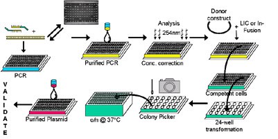 The HiTEL uses bespoke protocols to offer fully customised cloning and expression from various bacterial, parasite, animal and plant genomes. The group's parallel cloning strategy is based on semi-automated PCR technologies developed by the Protein Production and Structural Biology laboratories at the university. Target DNA sequences can be cloned into a range of specifically engineered expression vectors, using either ligation independent cloning (LIC) or InFusion cloning, with primers that are designed in house with the aid of purpose-built software. Working in a microplate format, this six stage process allows up to 96 targets to be cloned in parallel, and includes built-in verification of results and quality control steps. Figure 1 shows the semi-automated cloning pathway used in the laboratory, describing both cloning of the target DNA and transformation of the purified plasmid into an E. coli expression strain for small scale protein production. All constructs used in this process encode either an N-terminal or C-terminal histidine (His) tag, used for expression screening and affinity purification. The HiTEL has a library of expression vectors to offer a wide range of purification tags, including green fluorescent protein (GFP), glutathione-S-transferase (GST), maltose binding protein (MBP) and IM9. This process requires integration of many additional devices onto the laboratory's Freedom EVO workstation, including an automated thermal cycler to allow complete automation of target gene amplification and purification on the platform as well as automatic normalisation of sample concentrations. Subsequent ligation into plasmid vectors and transformation into suitable cell lines is also performed by the workstation, minimising variation between samples and reducing the risk of operator errors.