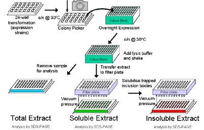 Following successful cloning, protein expression screening begins with transformation of purified plasmids into E. coli expression strains (BL21, Rosetta2, and B834 pLysS) (Figure 2). Positive colonies are induced with IPTG or transferred to auto-induction media to growth. Cell lysis is achieved using either sonication or a lysis reagent. A solubility screen is then achieved using filter-based technology and a vacuum manifold, followed by rapid analysis of the resulting fractions using SDS-PAGE and immunodetection techniques.