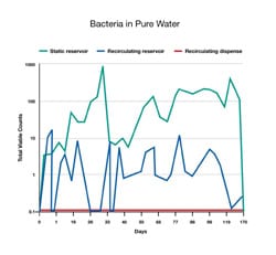Figure 3 shows bacterial data collected over a five-month period for three different types of system. The blue graph shows the water quality obtained from a static reservoir that has been filled with high purified water - the bacteria count has risen to over 1000cfu/ml. The green graph shows water from a similar reservoir with recirculation - the results are much better. By far the best results, however, are obtained from the system shown in the purple graph. Water is taken from a dispense tap that is part of the recirculating loop just after the active technologies and just before the return water is fed back into the reservoir. Even without a point-of-use filter, counts of less than 0.1cfu/ml are consistently achieved.