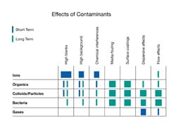 With regards to water purification, optimum results can be obtained by using a combination of complementary technologies, and Table 3 indicates the areas of peak effectiveness for each. All have their own strengths and there is some overlap between the different technologies. For example, reverse osmosis may allow some low molecular weight organic impurities to pass through the membrane, but they will be caught by adsorption on activated carbon. Ion exchange resins can also take out some colloidal materials, and even some gases while microfiltration can remove gases like carbon dioxide and oxygen if hydrophobic membranes are used.