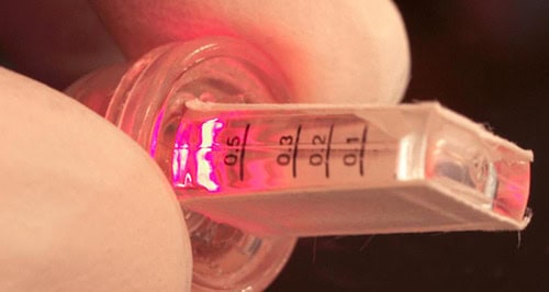 In the experiment the team used an EEG headset, recording brainwaves transmitted via Bluetooth to a controller, which in turn controlled an electromagnetic field generator to supply a implant in a mouse with an induction current. An integrated LED lamp in the near-_infrared wavelength range turned on in the implant illuminating a culture chamber containing genetically modified cells. When this light illuminated the cells, they began producing the desired protein.