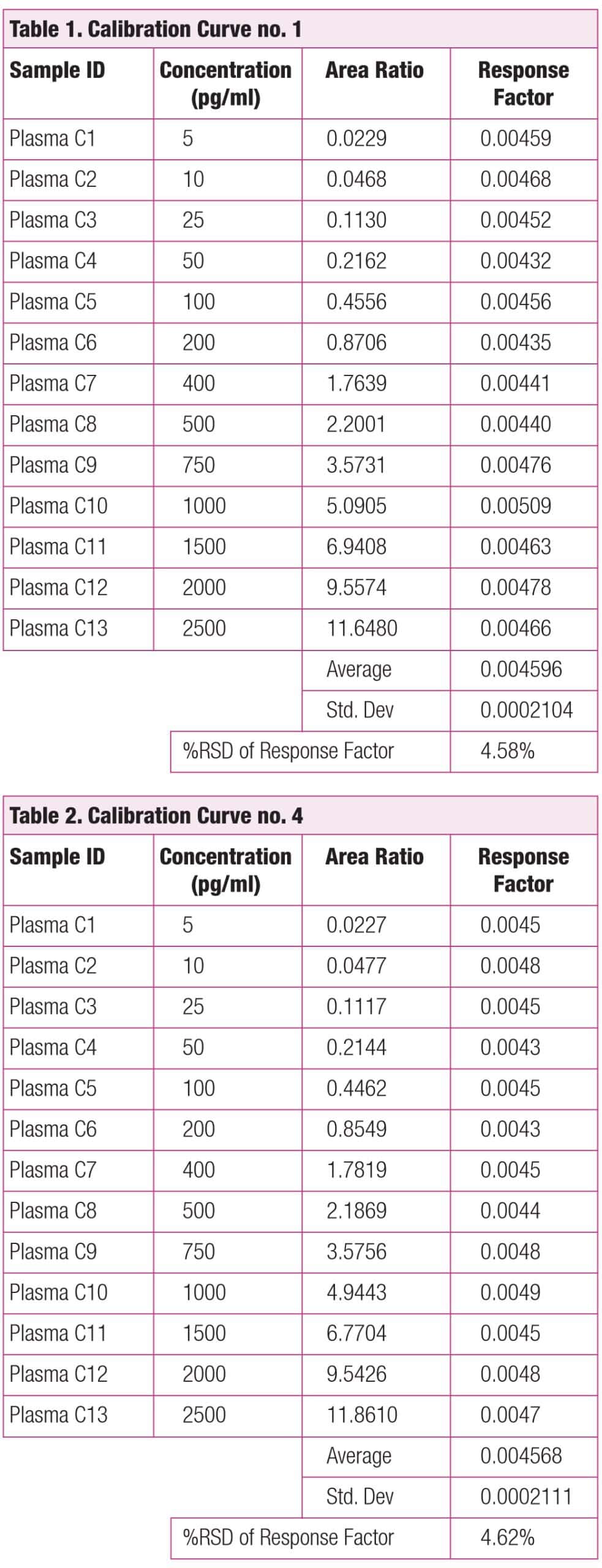 The response factor is the area ration (calibrant/IS) divided by the concentration of the calibration range. The RSD% of response factor is a stringent measure of sensitivity because it takes into account every calibration point on the curve. Any decrease in sensitivity will be reflected by a higher %RSD response factor. The %RSD of the response factors of the four calibration curves was less than 5%, which is well within the acceptable criteria of validated bioanalytical methods. Figure 1 shows the overlaid first and fourth calibration curves, indicating almost no divergence across the calibration range, indicating that all sensitivity accuracy and precision criteria were met. Tables 1 and 2 indicate the sustained high sensitivity performance of the ion source after repeated exposure to the plasma samples, a key requirement for the harsh environment in a routine bioanalytical laboratory. Figure 2 shows the chromatograms for the first calibration level (5ppt) for all four calibration curves.