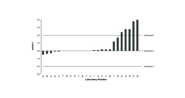 Take the example of pH in one of the wine samples. The distribution of z-scores was centered around zero, with a symmetrical distribution and the majority of participants have results between the +2 and -2 tramlines. These are the satisfactory performance limits, as described above.We can contrast this with the distributions for volumic mass at the defined temperature of 20°C.