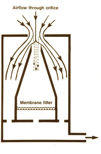 Yes. The internal geometry and inflowing air volume are critical design parameters (12). Approximately 97% of the inflowing air bypasses the nozzle housing the filter membrane. The volume flow rate ensures that air is not sucked out of the cabinet to distort the results.