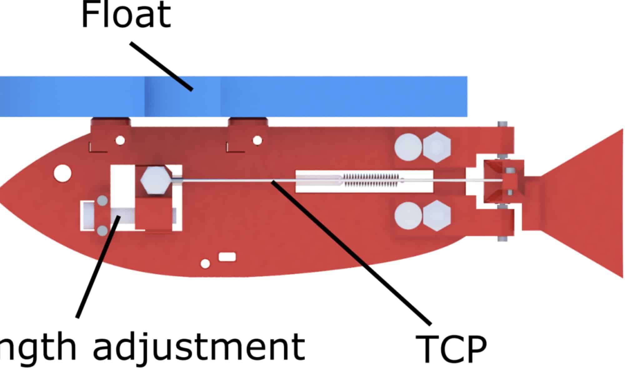 Minimising the distance between the TCP on one side of the robot fish and the spring on the other, activates the rear fin at the rear, allowing it to attain new speeds.