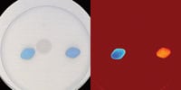Figure 3: Left: RGB image of counterfeit (left) and genuine tablet, visible differentiation is difficult. Right: Multispectral false colour image of the same samples, orange is genuine