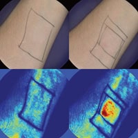 Colophony, a plant extract used in the manufacture of sticking plaster, can cause skin irritation. Recently, multispectral imaging has been used to detect skin irritation caused by band aids even before the ‘redness’ became apparent to the patient. By simply imaging skin before and after the sticking plaster was applied and removed a clear ‘redness’ due to the removal of skin and the presence of haemoglobin was apparent (Figure 6). Expanding the study showed a clear correlation between application/removal count and irritation. This objective measure of the degree of skin irritation is useful as it allows for faster and more reliable skin testing.