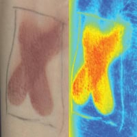 Multispectral imaging is also useful in studying skin pigmentation both in making a diagnosis and in assessing the effectiveness of treatment. Since the presence of hair can make some diagnoses difficult NIR wavelengths can be used to separate hair and skin image contributions. In Figure 7, the hair is ‘replaced’ by average skin colour allowing subtle changes in skin condition to be monitored more easily.