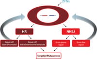 ZFNs are a class of engineered DNA binding proteins that facilitate targeted editing of the genome by creating double-strand breaks at user-specified locations. These breaks stimulate the cell’s natural DNA repair mechanisms – homologous recombination (HR) and non-homologous end joining (NHEJ) – which can be exploited to achieve rapid and permanent site-specific modification of the desired genes. While HR can be used to insert foreign DNA sequences, NHEJ allows the cell’s natural processes to create precisely targeted mimics of natural mutations which leave no traces of foreign DNA. Unlike previous techniques, ZFNs offer excellent sequence specificity, binding 24 to 36 base pair target sequences to virtually eliminate off target effects, and are able to achieve modification rates exceeding 20 %, well above rates for most other technologies.