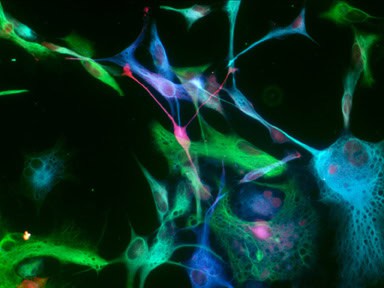 | Human brain progenitor, cultured cells were immunocytochemically stained for GFAP (blue AMCA), Doublecortin (red Cy2), and Nestin (green RRX). |