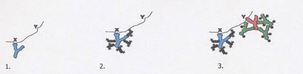 | Figure 2. Example B, Use of unconjugated Fab fragments to convert the first, primary antibody into a different species Steps: 1 Incubate with the first, primary antibody. 2 Incubate with an excess of unconjugated Fab antibody directed against the host species of the primary antibody. 3 Incubate with Probe 1-conjugated tertiary antibody [an anti-IgG (H+L) or an anti-F(ab')2] directed against the host species of the Fab antibody. It is very important that the tertiary antibody does not recognise the host species of the either the primary antibodies or the second, secondary antibody. 4 Incubate with the second, primary antibody. 5 Incubate with Probe II-conjugated to the second, secondary antibody (that does not recognise the host species of either the Fab antibody or the tertiary antibody). |