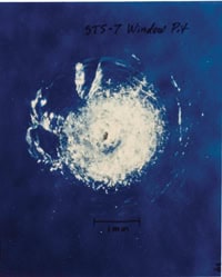 An impact crater on one of the windows of the Space Shuttle Challenger following a collision with a micrometeoroid – thought to be a fleck of paint – during STS-7