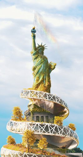 A spiral walkway was placed to add a touch of modernity to the statue. A fountain has also been created in the statue's signature torch to signify a connection to America's great lakes and surrounding coastline.