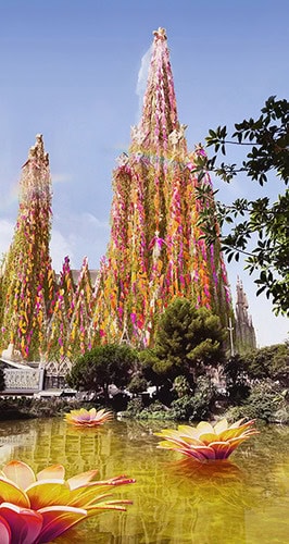We've redesigned the landmark in a biophilic way by creating a base layer of Mediterranean hanging plants like geraniums and durantas encasing the church. We then lined the body of the church with diamond-shaped mirrors decorated with shards of red, orange and pink, resembling the native flowers of Spain like Lantanas, Gazania, and Bougainvillea. Water sprays from the tops of the spires, splitting the light rays into beautiful rainbows. At the base of the church, we've placed mirror flowers in the ponds for more exotic beauty and colour.