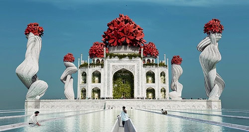 We redesigned the iconic pillars in the style of India's famous trail tree trunks, while sitting on top of the pillars are jungle geranium or Ixora Coccinea. Hanging plants appear on the walls behind the front-facing arches and window frames, and in place of the famous reflecting pool in front of the Taj Mahal, we created an extensive network of water bridges to reflect the importance of water in Indian cultures.